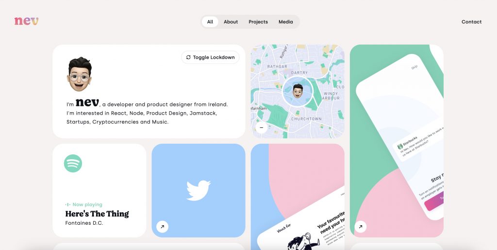 Якщо ви шукаєте натхнення для створення вебшаблону із розкладкою Bento Grid, відвідайте вебсайт Nev Flynn — він демонструє всі можливості цієї тенденції на практиці.